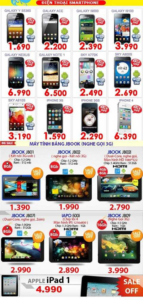 Khách hàng có cơ hội lựa chọn nhiều sản phẩm cấu hình cao với mức giá rất phải chăng như Galaxy y chỉ còn 1.690.000 đồng, Galaxy S i9000 chỉ còn 2.390.000 đồng, máy tính bảng nghe gọi JBook JB02 với mức giá chỉ còn 1.990.000 đồng