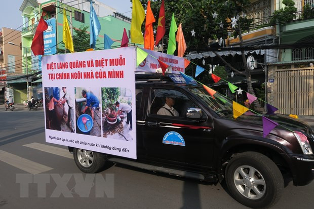 Xe cổ động diễu hành trên đường phố với những thông điệp kêu gọi diệt lăng quăng, phòng chống bệnh sốt xuất huyết. (Ảnh: Đinh Hằng/TTXVN)