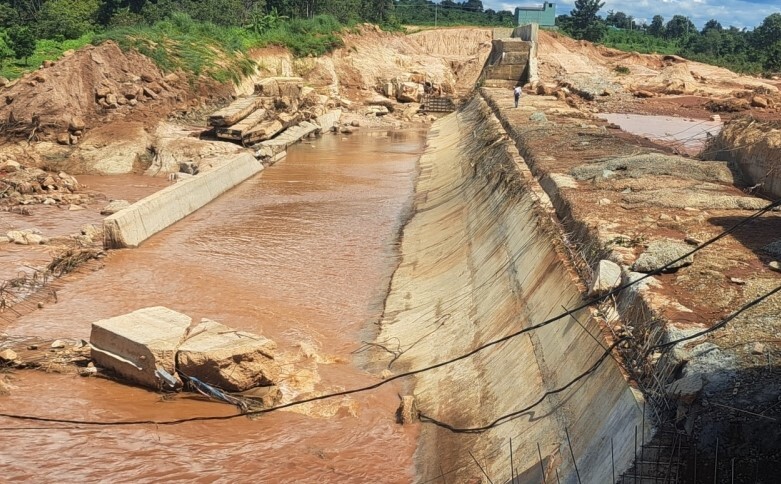 Dòng lũ đẩy trôi một phần bê tông tường phục vụ thi công đập tràn tự do của Nhà máy Ia Glae 2 đang thi công dang dở, chưa hoàn thiện toàn bộ kết cấu bê tông cốt thép.