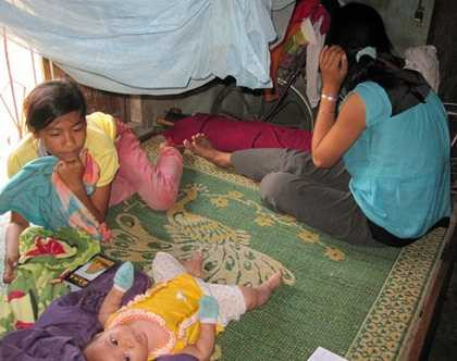 | Bà mẹ trẻ Y Sâm (áo xanh) cùng đứa con bốn tháng tuổi và cô em gái. |