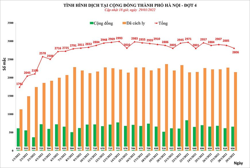 Trong ngày 29/1, Hà Nội có 2.806 ca nhiễm. Thành phố này vẫn đứng đầu cả nước về số lượng ca nhiễm. Trong 7 ngày qua, Hà Nội có tổng cộng 20.206 ca, trung bình mỗi ngày tăng gần 2.900 người có kết quả dương tính.