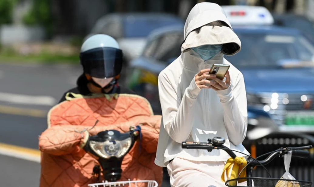 Người dân mặc áo chống nắng bảo vệ trong thời tiết nắng nóng gay gắt tại Thượng Hải, Trung Quốc, ngày 29/5/2023. (Ảnh: AFP/TTXVN)