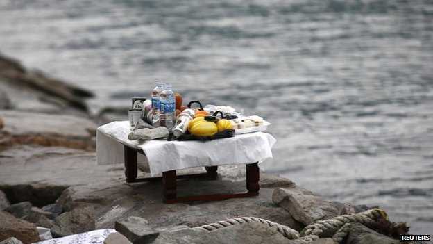 | Mâm cúng bên bãi biển hướng về phía các nạn nhân vụ chìm phà thảm khốc |