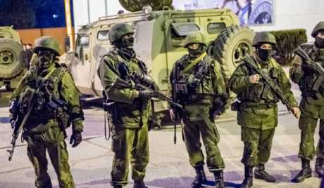 Các binh sĩ được xem là lính Nga đang đóng quân bên ngoài một số căn cứ quân sự ở Ukraine. Ảnh: REUTERS