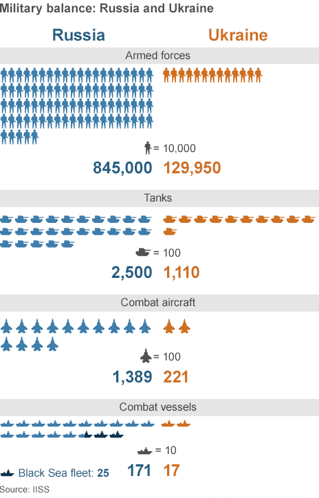 Theo thống kê, lực lượng vũ trang Nga hiện có 845.000 quân, còn Ukraine chỉ có 129.950 quân; Nga có 2.500 xe tăng trong khi Ukraine có 1.110 xe tăng; số máy bay chiến đấu của Nga là 1.389, còn phía Ukraine có 221 chiếc; tàu chiến của Nga gồm 171 chiếc, riêng hạm đội biển Đen có 25 chiếc, trong khi Ukraine chỉ có 17 tàu chiến.