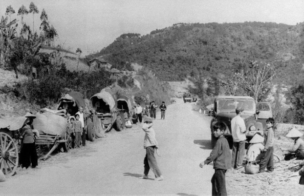Dọc đường, từng đoàn xe ô tô, xe ngựa, xe trâu... đủ loại phương tiện rồi người đi bộ bồng bế nhau lếch thếch đầy đường. Tìm một chỗ dưới mái hiên nhà ven đường cho gia đình xong, bố tôi cùng một số hàng xóm trở lại thị xã để thu dọn tiếp đồ đạc. Tại chỗ sơ tán tạm này, bên kia đường, trên sườn núi có một khẩu pháo có xe kéo của quân ta, vừa đi vừa bắn đùng đoàng, bọn trẻ con thích thú chạy ra xem, còn mấy bác lớn tuổi thì lo sợ quát tháo bảo tránh xa tìm chỗ nấp vì lo bị phản pháo...
