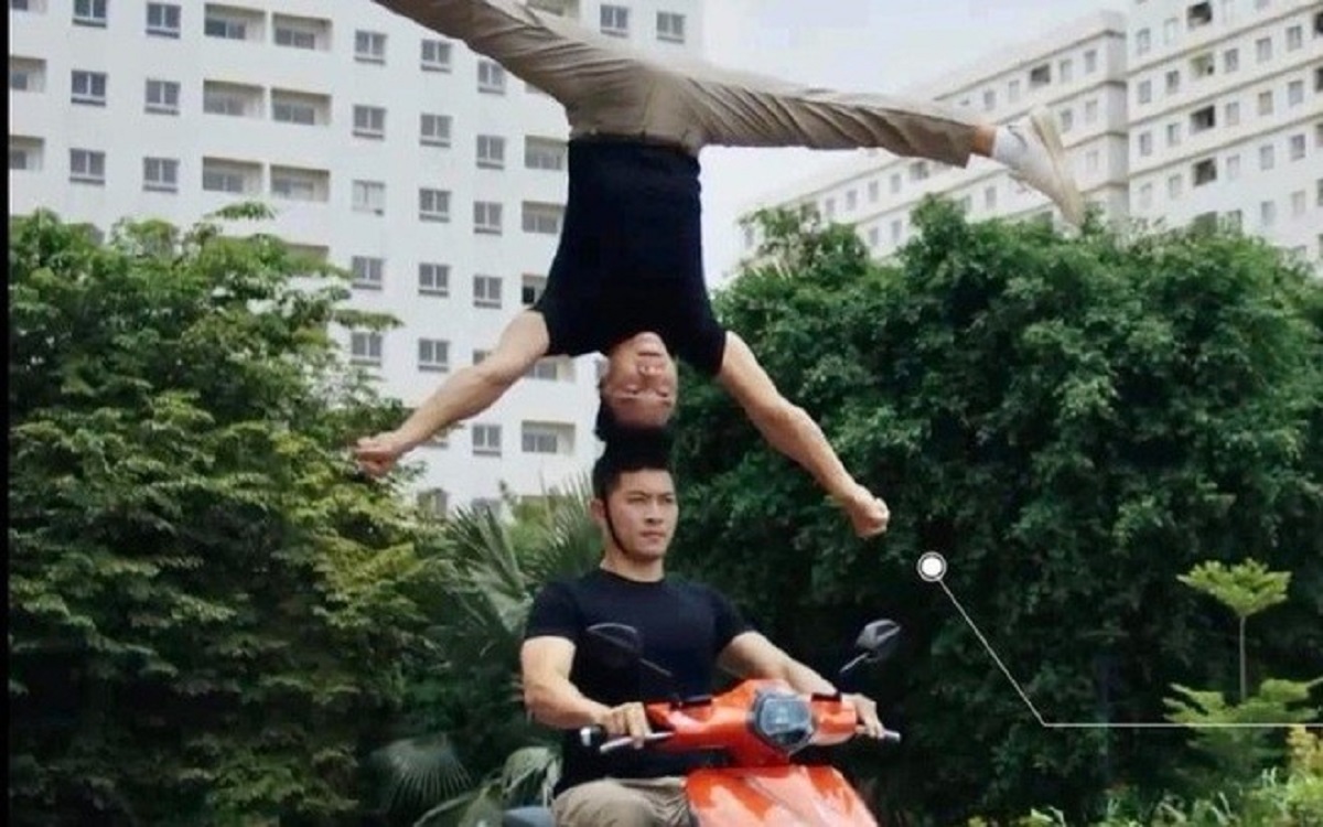 Hai anh em Quốc Cơ- Quốc Nghiệp biểu diễn chồng đầu đi xe máy. Ảnh cắt từ Clip.