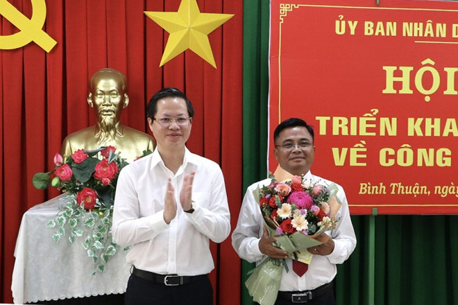 Ông Phan Dương Cường nhận hoa chúc mừng từ Chủ tịch UBND tỉnh Bình Thuận (Ảnh: T.T.D).