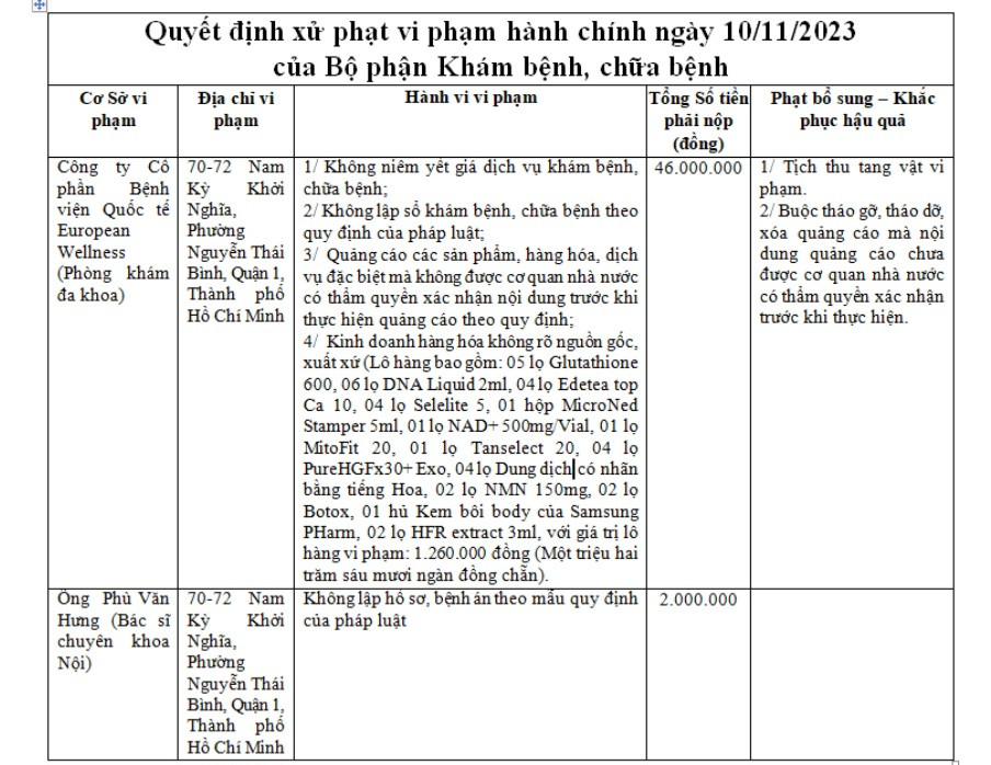 Cụ thể, Bệnh viện Quốc tế European Wellness đã có hành vi vi phạm, gồm: Không niêm yết giá dịch vụ khám, chữa bệnh. Không lập sổ khám, chữa bệnh theo quy định của pháp luật. Quảng cáo sản phẩm, hàng hóa, dịch vụ đặc biệt mà không được cơ quan Nhà nước có thẩm quyền xác nhận nội dung trước khi thực hiện quảng cáo theo quy định; kinh doanh hàng hóa không rõ nguồn gốc, xuất xứ với giá trị lô hàng vi phạm là 1.260.000 đồng.