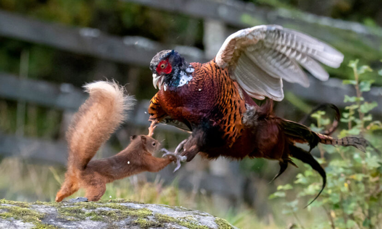 Nhiếp ảnh gia nghiệp dư Louise Philips ghi lại cuộc ẩu đả giữa sóc đỏ và gà lôi tại một điểm quan sát động vật hoang dã ở Blairgowrie, Perthshire, Unilad hôm 15/10 đưa tin.