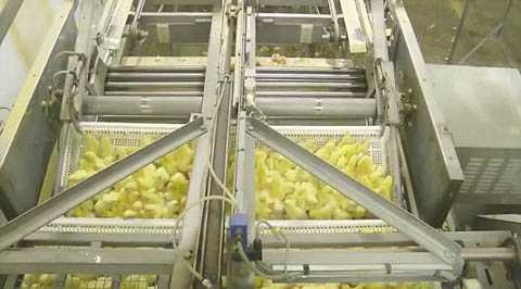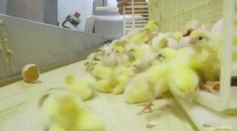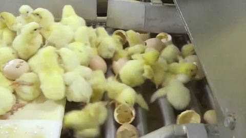 Hàng ngàn con gà công nghiệp mới nở bị chất đống trong các thùng và được đưa vào băng chuyền để chọn lọc rồi bị nghiền nát nếu không đạt tiêu chuẩn.