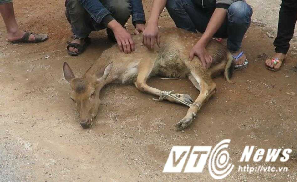 Tại đây, có một con nai còn sống, dù bị trói chân nhưng vẫn phải nhờ thêm sức hai thanh niên mới giữ được chặt, được rao bán với giá là 10 triệu đồng.