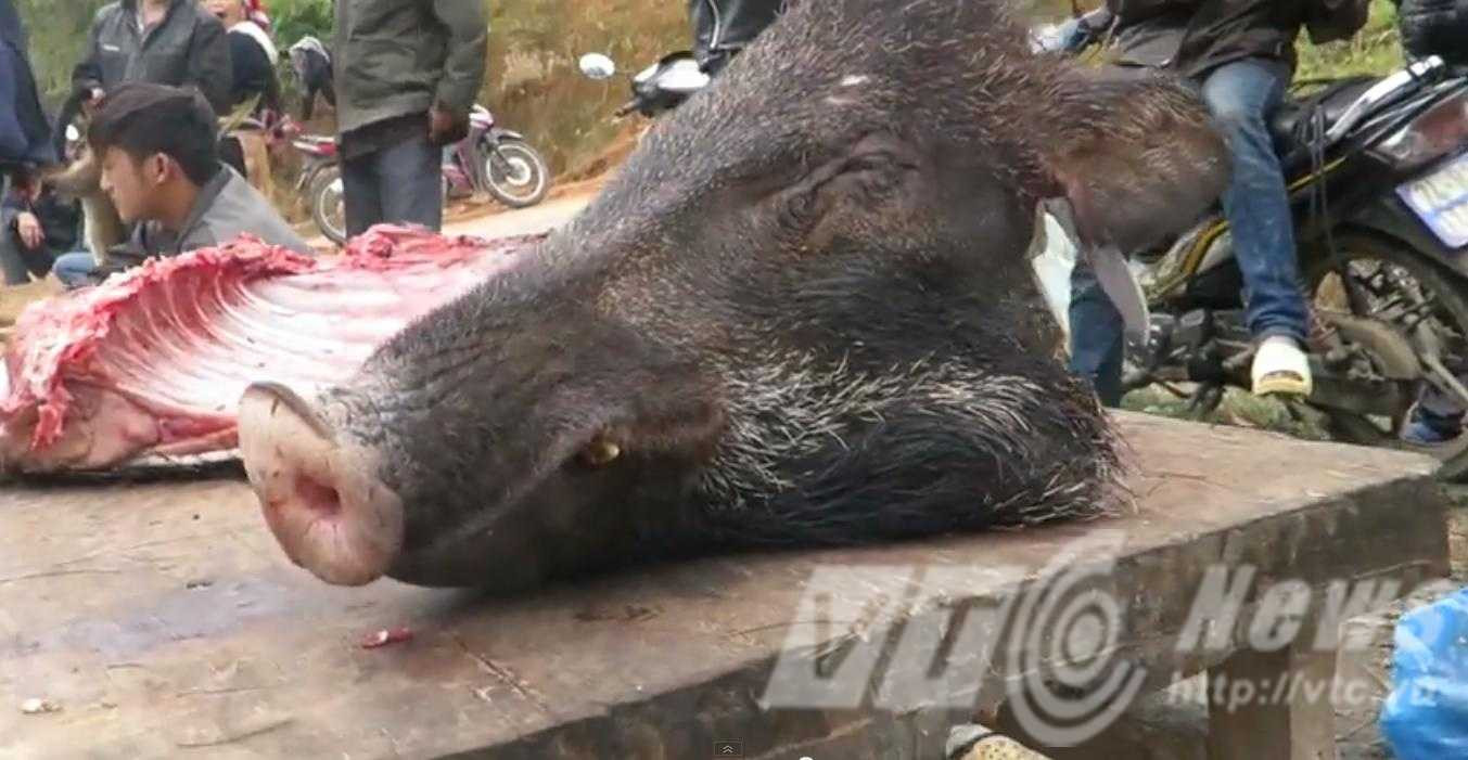 Chưa hết, thịt lợn rừng cũng được bày bán nguyên con tại đây, thậm chí còn được mổ bụng, xẻ thịt sẵn chỉ chờ người tới mua.