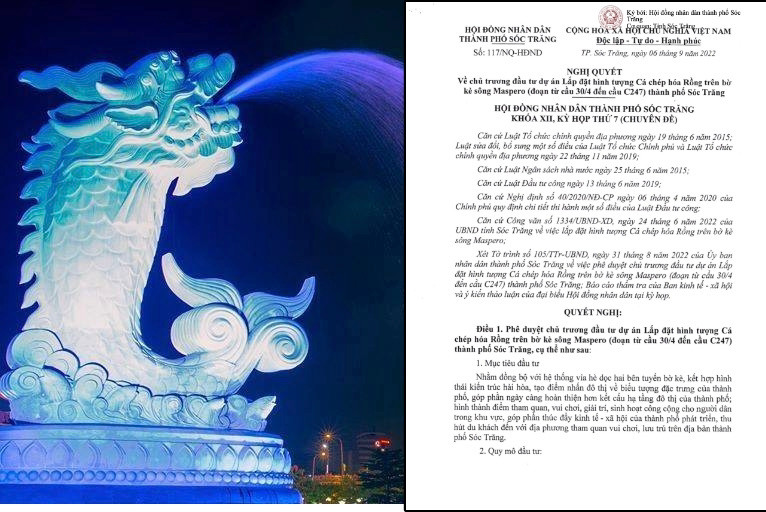 Theo Nghi quyết, 2 biểu tượng “Cá chép hóa rồng” sẽ được đặt tại 2 bên bờ kè sông Maspero (TP Sóc Trăng) với kích thước tổng thể 5.6mx8.32m. Tổng mức đầu tư dự án là 14.995.000.000 đồng từ nguồn vốn phân cấp ngân sách thành phố.