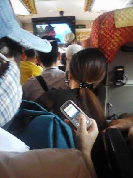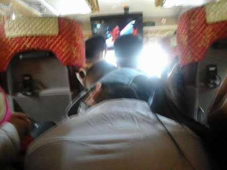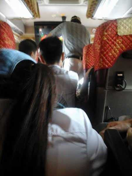 Do quá đông nên hành khách phải chen chúc rất khổ sở, 3-4 người ngồi trên ghế chính dành cho 2 người, có người phải ngồi trên “ghế phụ” đặt giữa hai hàng ghế chính. Hàng ghế cuối cùng vốn chỉ dành cho 4-5 người, nhưng trên chuyến xe có tới 7-8 người chen nhau ngồi.