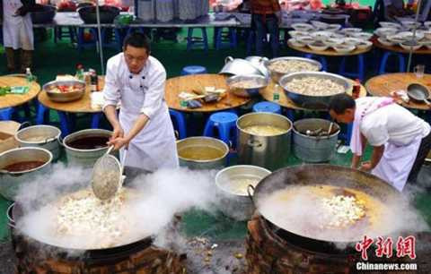 | Có khoảng 215 bàn tiệc được bày ra tại một khoảng đất rộng. |