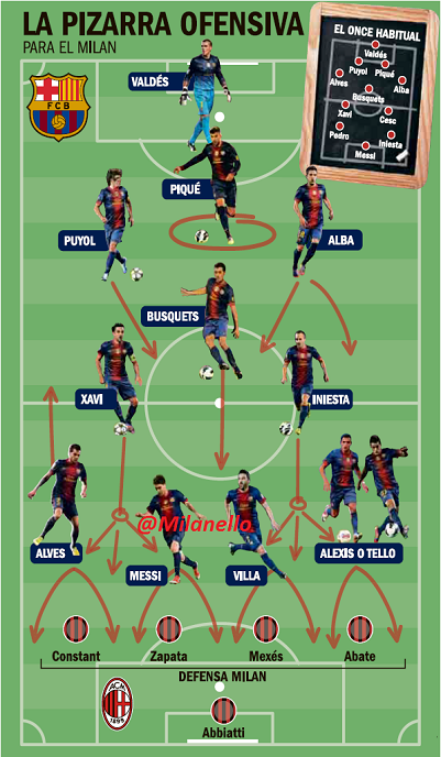 Nhiều khả năng Milan sẽ tiếp tục chơi với đội hình lùi sâu ở sân nhà, và chỉ tích cực tranh chấp khi bóng đã được đối phương đưa ra đường biên ngang giữa sân. Ngay cả 3 cầu thủ tấn công (nhiều khả năng sẽ là Niang- El Shaarawy- Boateng) cũng sẽ chơi thấp để gây áp lực với các tiền vệ Barca, trong khi tuyến tiền vệ tìm cách bịt mọi khoảng trống trước vòng cấm địa cũng như phong tỏa các đường đi bóng của Messi hay Iniesta.