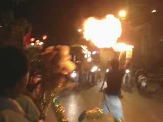 Sôi động màn múa lân phun lửa xin tiền trên phố đêm