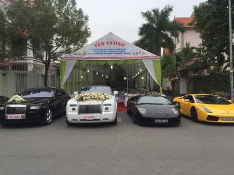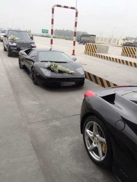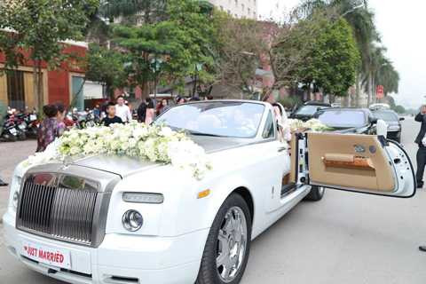 Dàn siêu xe ông xã Á hậu sử dụng để đón dâu gồm nhiều chiếc xe từ nhiều thương hiệu nổi tiếng như Rolls-Royce Gost màu đen, Rolls-Royce Phantom mui trần 2 cửa màu trắng, Lamborghini Murcielago đen và Lamborghini Gallardo vàng...