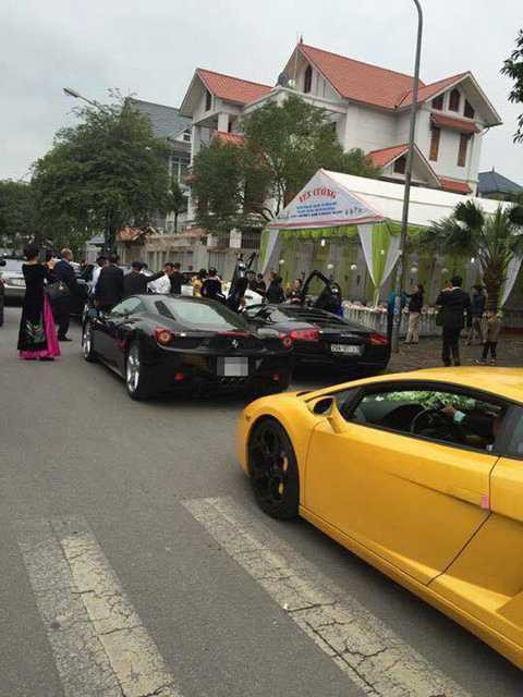 | Ngoài các siêu xe và xe sang như Rolls-Royce, May bach, Mercedes-Benz, Lamborghini, Range Rover... hai "siêu ngựa" Ý của Ferrari cũng có mặt. Với dàn siêu xe rước dâu lên đến cả trăm tỷ này, có thể xem đây là đám cưới với đoàn xe rước dâu "khủng" nhất Việt Nam trong năm Bính Thân 2016. |