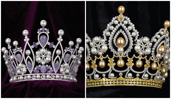 Chiếc vương miện trị giá hơn 3 tỷ được kiến tạo từ vàng kết hợp cùng 12 viên ngọc trai Akoya, 9 viên ngọc trai South Sea, 1641 viên kim cương và 581 viên đá Aquamarine.