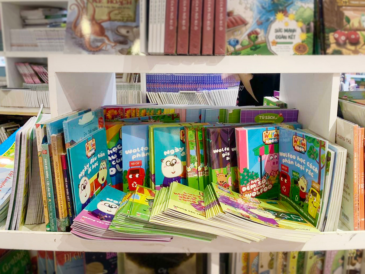 Các sản phẩm sách truyện Wolfoo đầu tiên tại Việt Nam trên hệ thống nhà sách lớn toàn quốc.