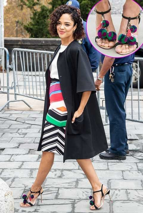 | Tessa Thompson trong lần tham dự sự kiện vào tháng 11 vừa qua đã chọn sandals "Layla" Sophia Webster mà điểm nhấn là chuỗi bông, tua rua đầy màu sắc. |