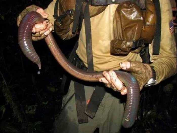 2. Giun đất khổng lồ. Thực sự loài vật này không hề độc hay gây nguy hiểm cho con người. Tuy nhiên, chiều dài hơn 3m của chúng có thể khiến không ít người giật mình sợ hãi