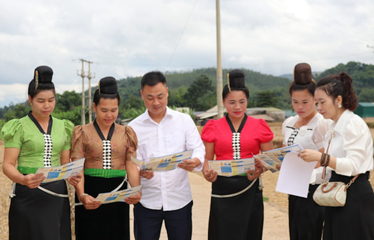 Viên chức BHXH huyện Quỳnh Nhai tuyên truyền chính sách BHXH, BHYT cho hội viên Hội Phụ nữ huyện Quỳnh Nhai. (Ảnh: Ngọc Mai)