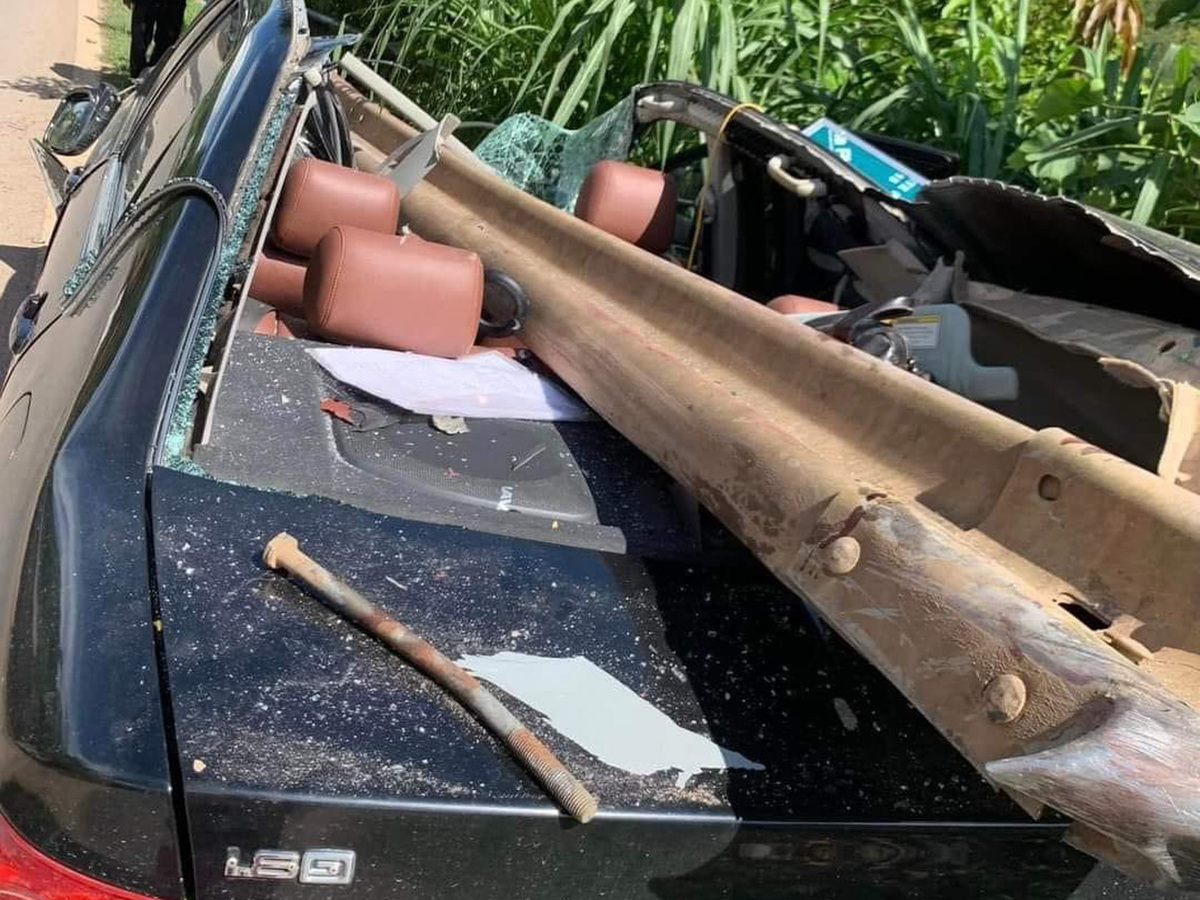 Tại hiện trường, ô tô nằm dưới hộ lan đường sau khi lao xuyên qua hộ lan, phần đầu, kính lái và nóc xe hư hỏng nặng.