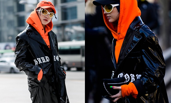 Nam ca sĩ chọn áo khoác dáng dài với chất liệu bóng loáng màu đen, phối cùng với nón màu cam và mắt kính nổi bật.
