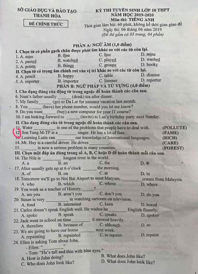 Sơn Tùng M-TP xuất hiện ở câu hỏi phần B (ngữ pháp và từ vựng), chọn dạng đúng của động từ để hoàn thành câu: “Son Tung M-TP is a…(FAME) singer. He has a lot of fans”. (Tạm dịch: Sơn Tùng M-TP là một ca sĩ nổi tiếng. Anh ấy có rất nhiều người hâm mộ).