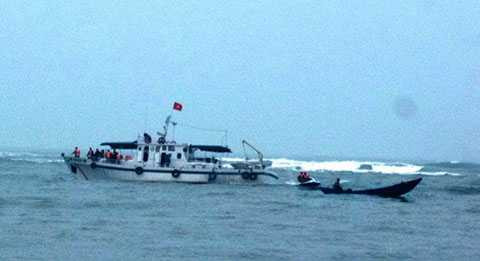 | Tàu kiểm ngư cùng hai ca nô tiếp cận tàu cá |