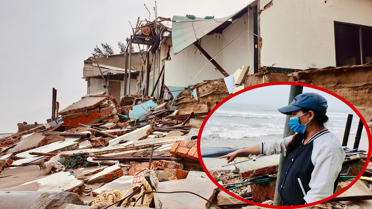 "Dọc đoạn bờ biển này có tổng thảy 5 ngôi nhà nằm san sát của 5 anh em tôi. Lo sợ triều cường sẽ gây ngập sâu nhà cửa, chúng tôi quyết định khăn gói sơ tán đến nhà bà con lánh nạn. Tờ mờ sáng hôm sau, tôi cùng một chị gái và ông anh lật đật quay về xem tình hình thì bàng hoàng khi thấy cảnh tượng trước mắt" - giọng nghèn nghẹn, chị Hường nói rồi mô tả những mái ấm tránh nắng che mưa của đại gia đình lúc này chẳng khác nào "bãi chiến trường".