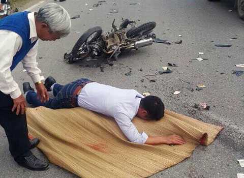 Thấy vậy, anh Bình cũng lái xe chạy nhanh nhưng gặp chướng ngại vật nên phải phanh gấp khiến anh đâm phải một chiếc xe tải đang chạy trên đường. Cú tông mạnh khiến anh Bình bị văng ra khỏi xe, nằm bất động, chiếc xe máy hư hỏng nặng.