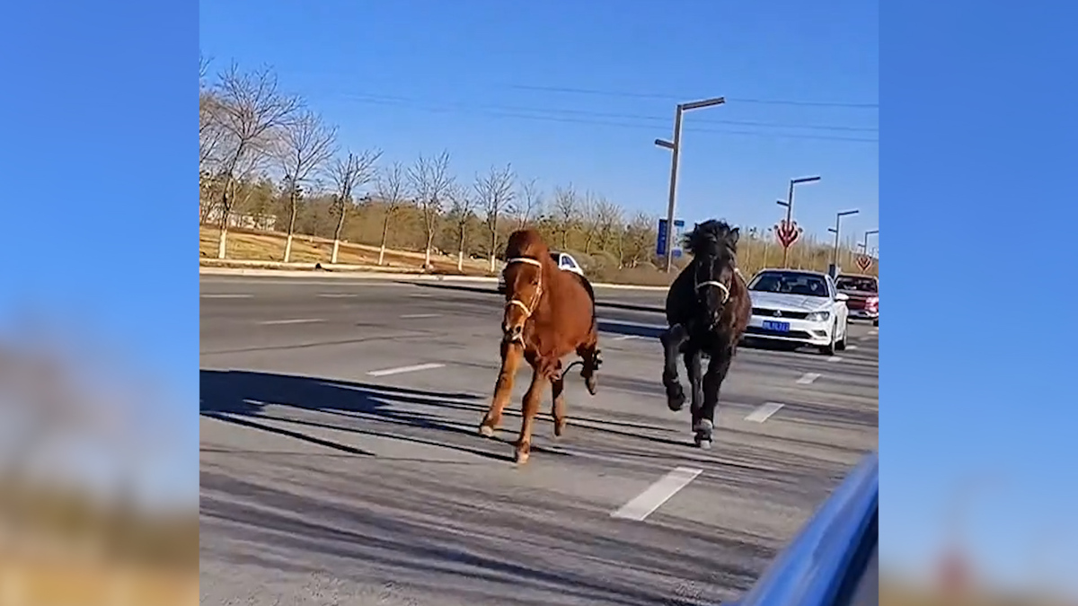 Hai con ngựa bất ngờ xuất hiện và phi nước đại giữa các phương tiện trên đường cao tốc ở Nội Mông, Trung Quốc.