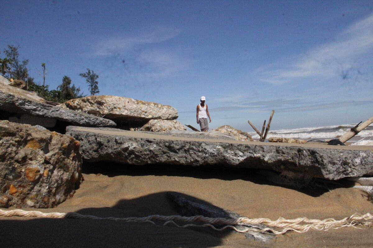 Theo người dân địa phương, do ảnh hưởng của mưa bão trong vòng một tháng qua, sóng lớn cuộn trào liên tục vỗ xô vào bờ, đánh tan tác đoạn kè ven biển.