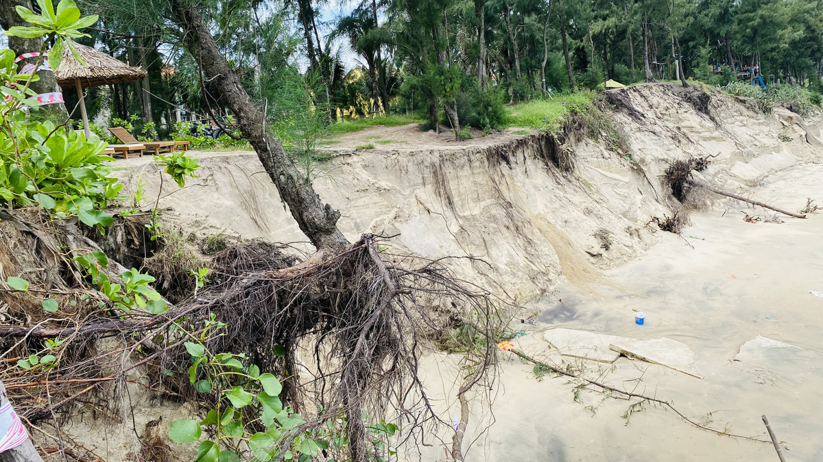 Theo người dân địa phương, tầm 1 tháng trở lại đây, hàng trăm mét bờ biển Hội An (đoạn thuộc khối phố Tân Thành, phường Hội An Tây) liên tục bị đặt trong tình trạng báo động do sóng dữ "ngoạm" sâu vào bờ, gây xói lở nặng.