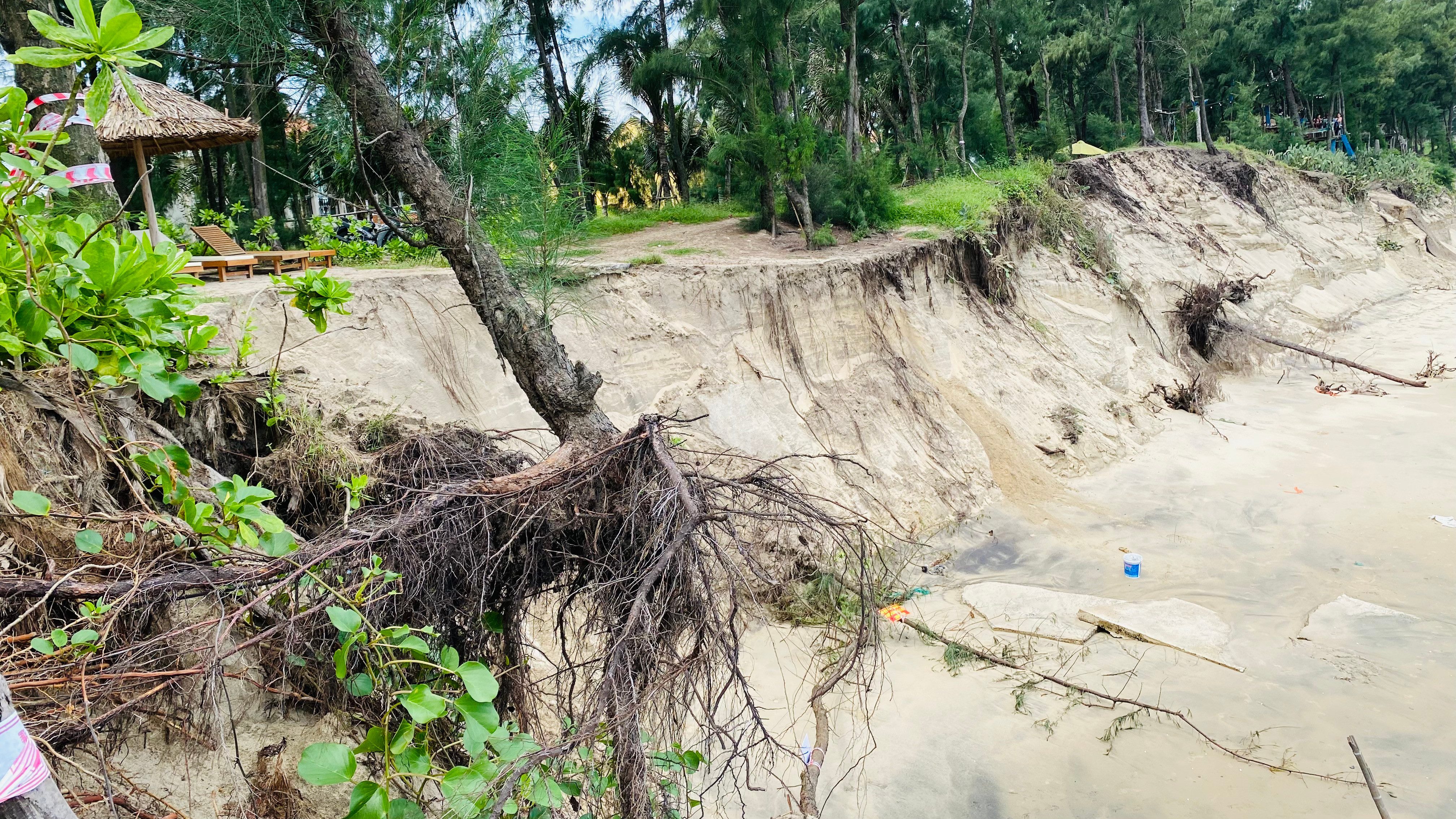 Sau khi "xuyên phá" lớp kè được dựng lên từ những bao cát "khủng", sóng lớn "ngoạm" bật gốc phi lao và tiếp tục "ăn" sâu vào bờ.