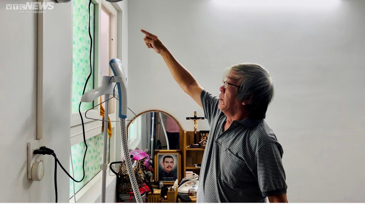Căn hộ nhà ông T. có 2 phòng ngủ và 1 phòng khách, luôn trong tình trạng thấm tường và ứ đọng nước nền nhà. "Vì thấm và ứ đọng nước lâu quá nên nhà tôi đã có lần bị chập nổ điện gây nguy hiểm, may tôi và bà ấy không sao. Tôi cũng đã phải chạy lại hết đường điện lộ ra bên ngoài. Đồ đạc đều phải lót ni lông chống thấm và sử dụng sạp gỗ nhằm ngăn cách với nền nhà.", ông T. bức xúc.