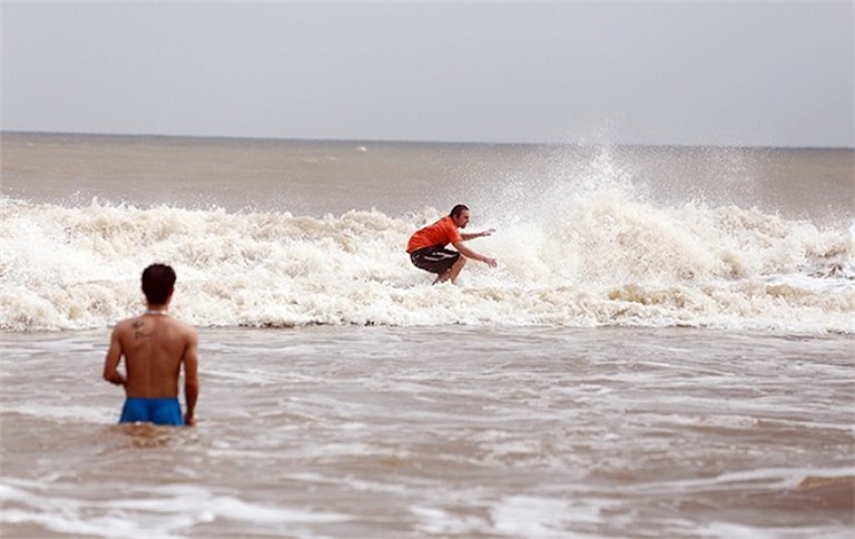 Biển động kèm theo những đợt sóng cao 2m, nhưng nhiều du khách trong và ngoài nước vẫn đùa nghich, thậm chí lướt ván trên con sóng dữ. (Tri Thức)