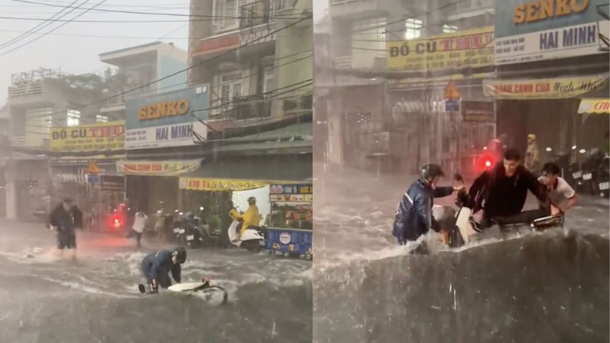 Trong clip được lan truyền mạnh trên mạng xã hội, một người lái xe máy sang đường trong cơn mưa lớn, nước ngập nửa thân xe. Bị dòng nước chảy xiết hất đổ nhào, tài xế luống cuống cố gắng ngăn chặn chiếc xe máy để nó không bị cuốn trôi nhưng lực bất tòng tâm. Thấy vậy, 3 thanh niên đang đứng trú mưa không ngại nguy hiểm lao ra giúp đỡ chống lại sức mạnh của dòng nước không kém gì lũ cuốn, đưa chiếc xe máy và tài xế vào lề đường an toàn.