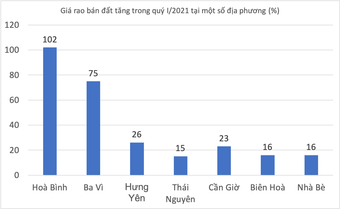 Báo cáo thị trường quý 1/2021 mà trang Batdongsan.com.vn vừa công bố, nhiều nơi có giá rao bán đất tăng vọt, thiết lập mặt bằng giá mới. Có thể kể đến như: Hòa Bình (tăng 102%), Ba Vì (tăng 75%), Hưng Yên (tăng 26%), Thái Nguyên (tăng 15%)…