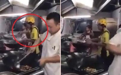 Sự việc xảy ra tại Trung Quốc. Clip ghi lại cảnh nam thanh niên giao hàng vẫn còn khoác túi và đội mũ bảo hiểm đang lăn xả vào bếp, xào nấu trên chảo có vẻ rất lành nghề.