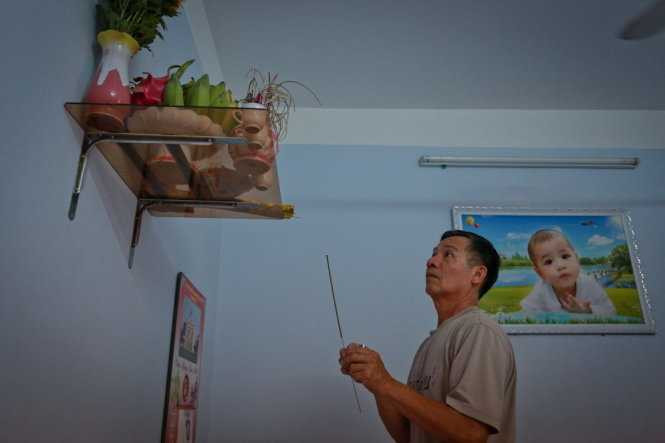 | Ông Nguyễn Văn Thi - cha của đại úy, phi công Nguyễn Anh Tú thắp hương khấn nguyện mong tin tốt lành của con trai - Ảnh chụp sáng 17/4. |