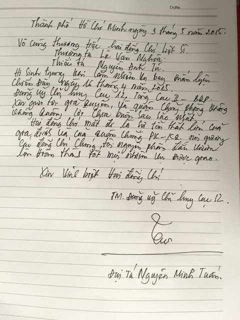 Chúng tôi nguyện học tập và hoàn thành tốt mọi nhiệm vụ, xứng đáng với sự hy sinh của hai đồng chí góp phần vào sự nghiệp bảo vệ và xây dựng đất nước. Thành kính phân ưu cùng gia quyến hai đồng chí”.