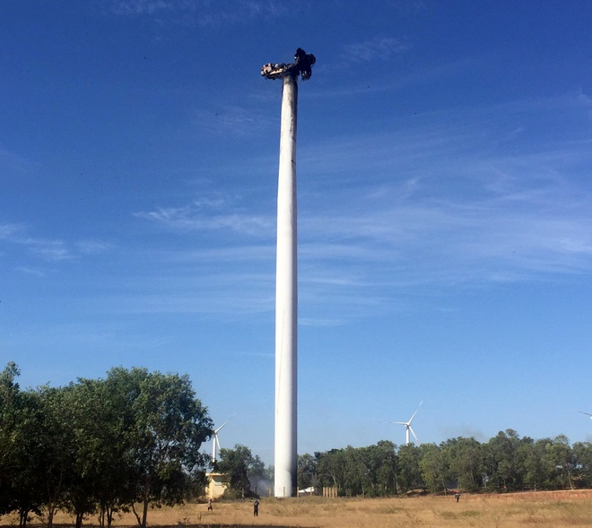 Trụ điện gió đầu tiên tại Việt Nam bị cháy. (Ảnh: Tuấn Kiệt)