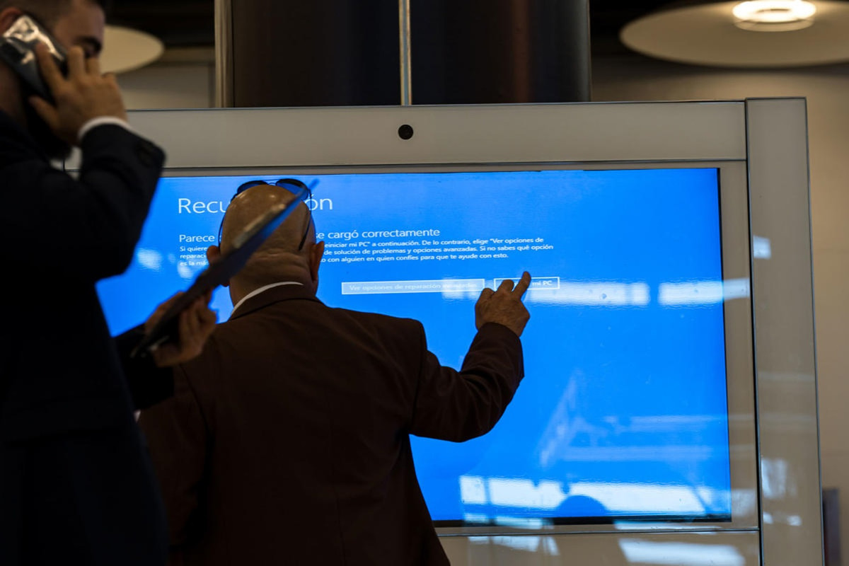 Một màn hình tại sân bay hiển thị "màn hình xanh chết chóc" sau khi phần mềm CrowdStrike gặp sự cố cập nhật hôm 19/7. (Ảnh: Europa Press)