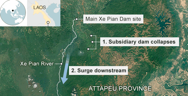 Ít nhất 20 người chết và hơn 100 người mất tích trong vụ tai nạn vỡ đập thủy điện đang xây dựng ở Đông Nam Lào, cùng với hơn 6.600 người mất nhà cửa.
