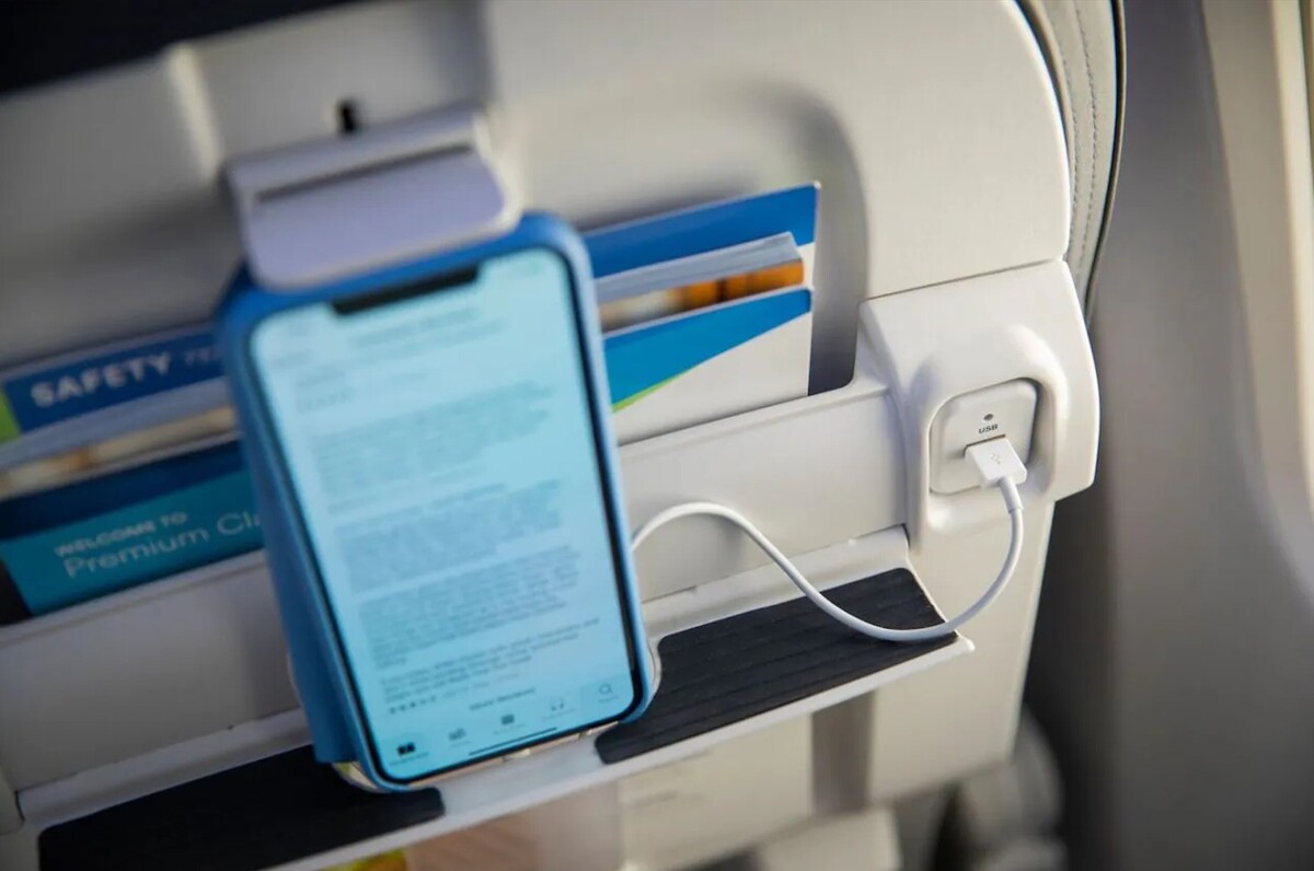 Nhiều hãng hàng không hiện nay đã cung cấp cổng và ổ cắm USB ngay tại ghế ngồi để hành khách có thể sạc trực tiếp các thiết bị điện tử của mình. Điện áp của ổ cắm trên máy bay là 110V AC với công suất tối đa 100 watt. Điện áp của cổng USB là 5V DC với dòng điện tối đa 500 mA.